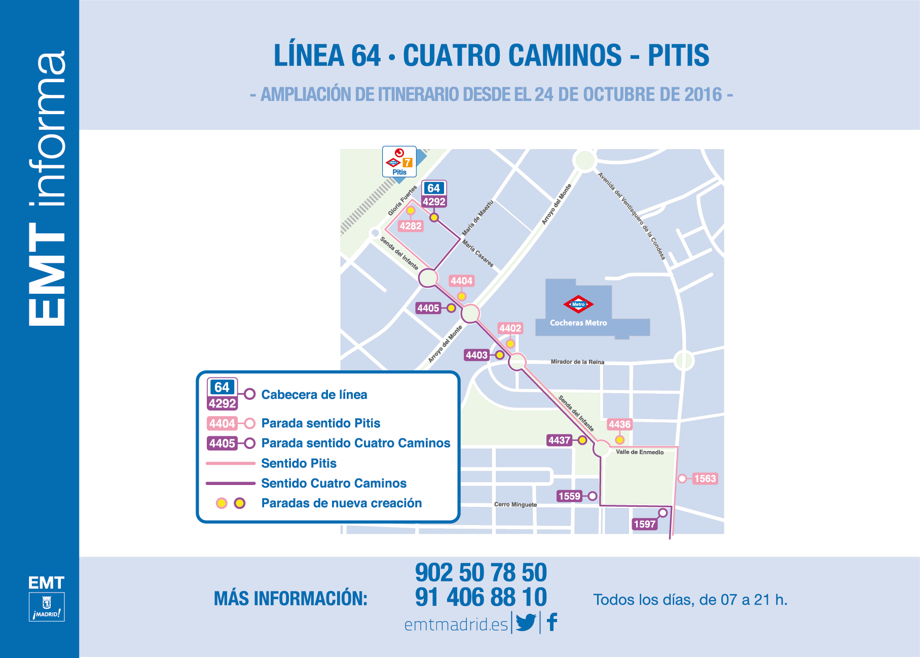 El distrito de Fuencarral-El Pardo se verá favorecido por las novedades de servicio que la EMT implantará a partir del día 24 de octubre. En este caso, la línea 64 (Cuatro Caminos-Arroyofresno) amplía su recorrido hasta la estación de Pitis del mismo modo que hiciera la línea 49 el pasado mes de junio.Desde su actual cabecera en la glorieta de la Pradera de Vaquerizas, la ruta 64 continuará por las calles Senda del Infante y Gloria Fuertes hasta la estación de Pitis, estableciendo su cabecera en la calle Marta Casares, junto a la de la línea 49.